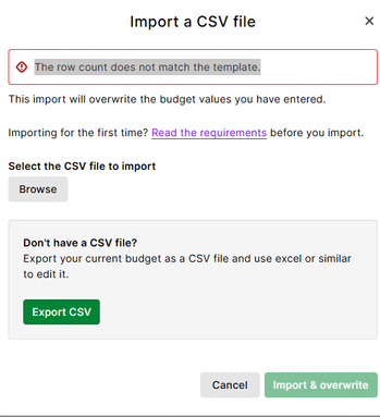 No worries, we’ll get this sorted. The “row count does not match the template” error appears when the file’s layout doesn’t match the budget template MYOB expects. The quickest fix is to export the budget straight from the Budget screen as a CSV and use that file as your starting point. I’ll also share this forum post and this link with extra tips to help resolve import error.