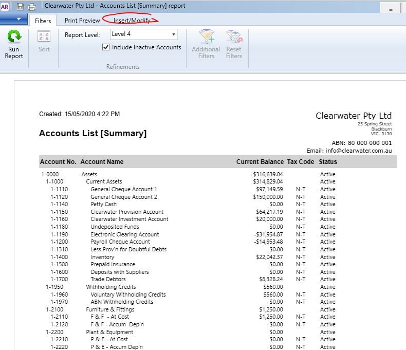 Thank you, nearly there...but! When I Display the Report, I have 8 pages. Then when I go into Insert/Modify and I add the Status, Tax Code etc. and it's all good EXCEPT that it's only 1 page of the Accounts List, not the entire 8 that make up the Report.
