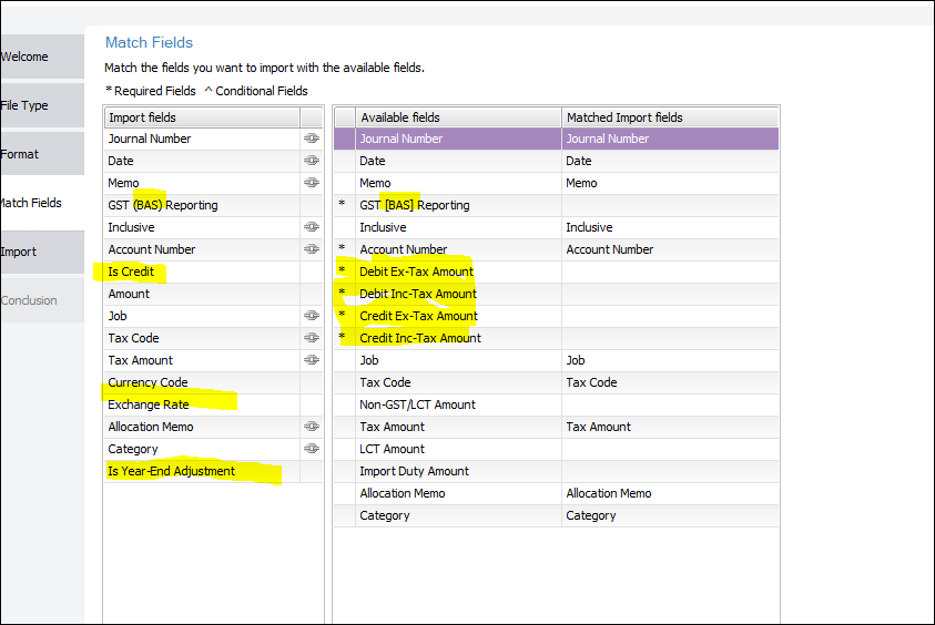 General journal fields for import