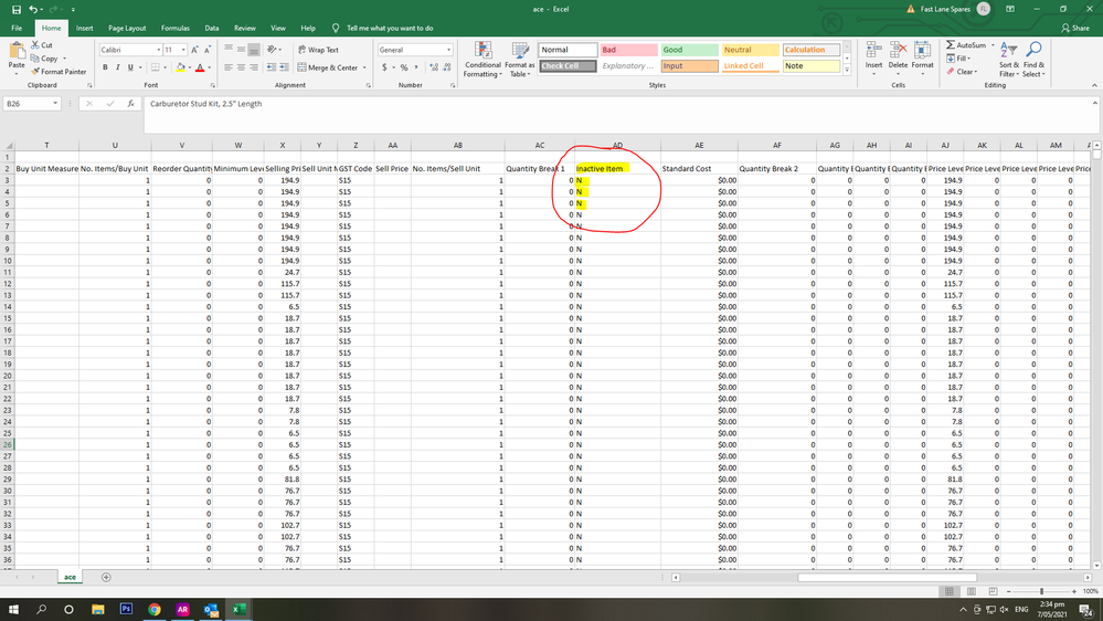 Hello, I am trying to import a heap of items.. however when I import the items they're shown in MYOB as inactive, even though I have formatted them to be active, see below photo, is this correct? Can't seem to work it out.