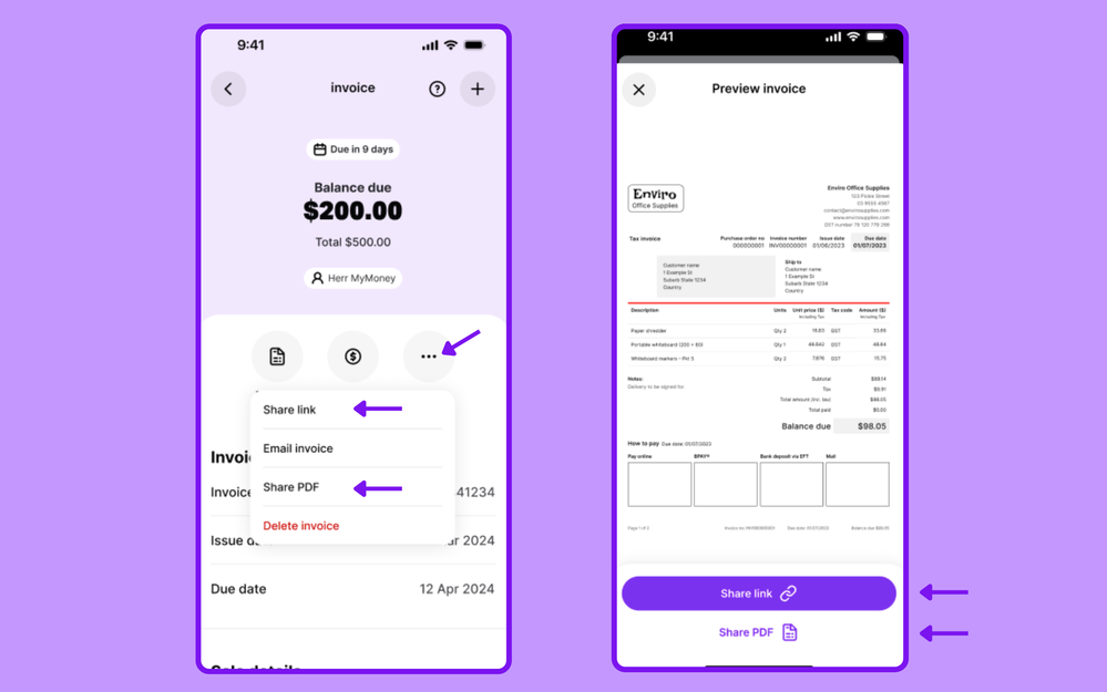 We've got a hot new version of the app ready for download that has both options; share a link AND share PDF. This should make downloading your invoices simpler, while still giving you the option to send a link when that suits.