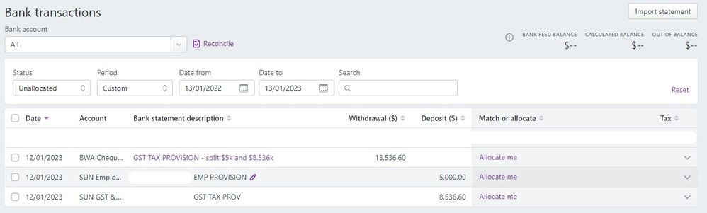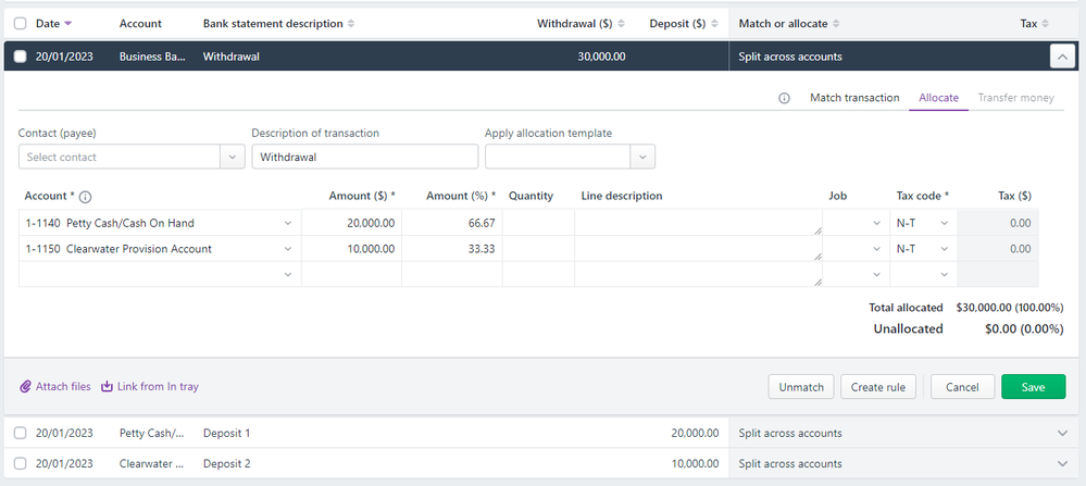 The issue I have is that I am now unable to simple click the dropdown next to Allocate Me, select "Transfer money" because this process relys upon matching values (problem caused by the split in the transfer).