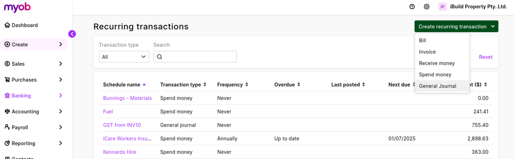 I've created some Recurring Transactions, some are Spend Money and some are General Journals. But why can't I create a Recurring Transfer transaction? Should I not be using them? If you can't make a recurring version, that seems to indicate to me that it is being dissuaded from being used at all. Is there something wrong with using Banking > Transfers that I am unaware of?