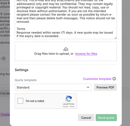 https://app.myob.com Hi, I can't believe I'm on the forum day one of usage with an issue. I'm trying to send my first quote and wanting to email it to the customer. Clicking the "I'm not a robot" r...
