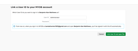 - Select the administrator user again and check "This user will sign on with my.MYOB account."