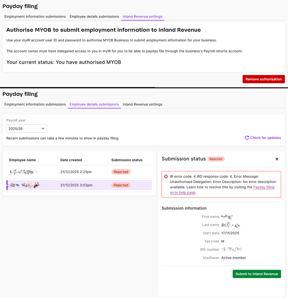 I have a new business with 2 employees only. But I can't submit their details to IRD even though I have authorised MYOB in my business IR account.