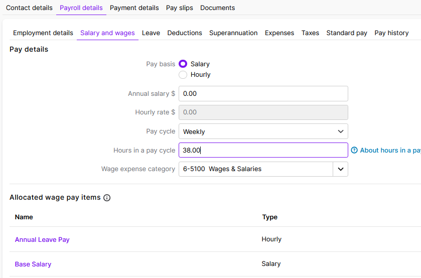 Nice work getting into payroll setup. It can be a bit to figure out at first, but you're absolutely on the right track! The reason the salary amount is showing as $0.00 is because it hasn't been setup yet. MYOB doesn't fill that in automatically. You need to enter their correct pay rate or annual salary. Once that's in, It can start calculating everything properly, including leave.
