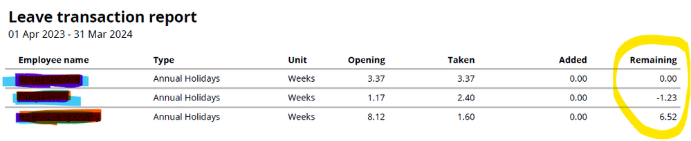 There are seven columns in Leave transaction report as following. I just wondering if the annual holidays only include annual leave or still include 8% holiday pay. For example, the third row remaining 6.52 weeks, is that include 8% holiday pay or only annual leave? Could you let me know? If not include 8% holiday pay, how can I get the 8% holiday pay report?