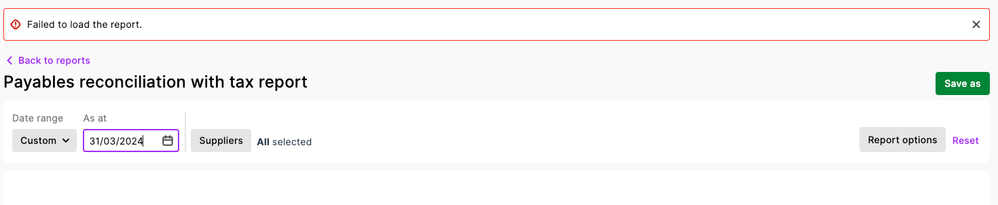 Hi, im trying to run a "Payables reconciliation with tax report" for the last financial year but i get an error saying "failed to load the report"