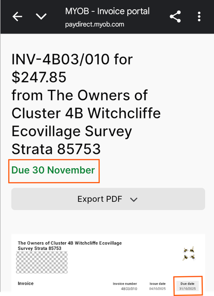 Good pick-up on the mismatch between the online invoice header and the due date on the invoice (top shows Due 30 November while the invoice shows 31/10/2025). This happens if the invoice was emailed with the original date (A) and the terms were changed later to a new date (B), as the online view keeps the first date until you resend the invoice. To sort this out,