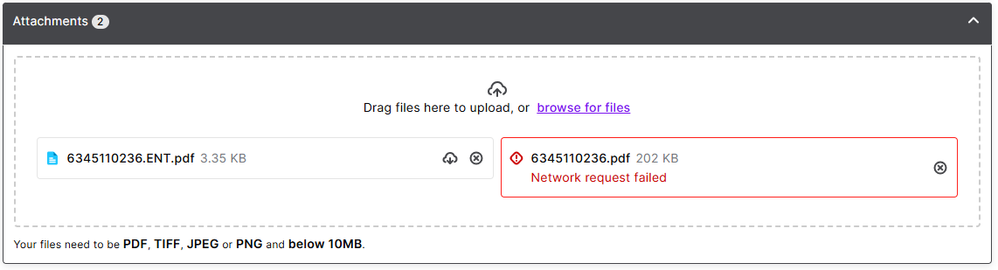 When attempting to upload documents into MYOB, the system repeatedly displays the error: “Network request failed.”