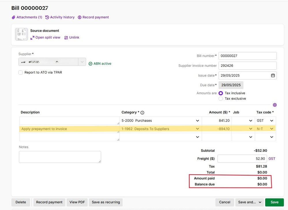 When you see the payment in your bank feeds, don't go straight to allocating it as a supplier deposit again – that'll just double things up. Instead, match that bank feed payment with the existing bill. If you've accidentally ended up with the payment marked as a deposit twice, you'll need to either undo the transaction or make a supplier debit note.