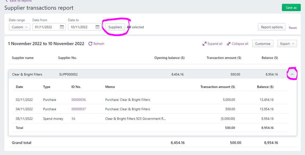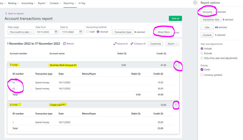 As explained previously the Account Transactions report will display both the debit and credit sides of the transactions. You can filter by specific accounts in Report options. In this example I have selected the Business bank account and Credit card in the Account filter and Coles in the Contacts filter. Clicking on the expand arrow lists the transactions posted to those specific accounts. Clicking on the ID number will open the transaction to see the allocation accounts.