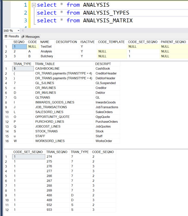 Example of the ANALYSIS, ANALYSIS_TYPES and ANALYSIS_MATRIX tables