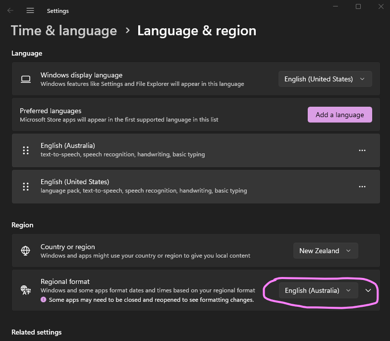 - In the Region Settings screen, change "Regional format" to "English (Australia) rather than "English (New Zealand)" or "Recommended"
