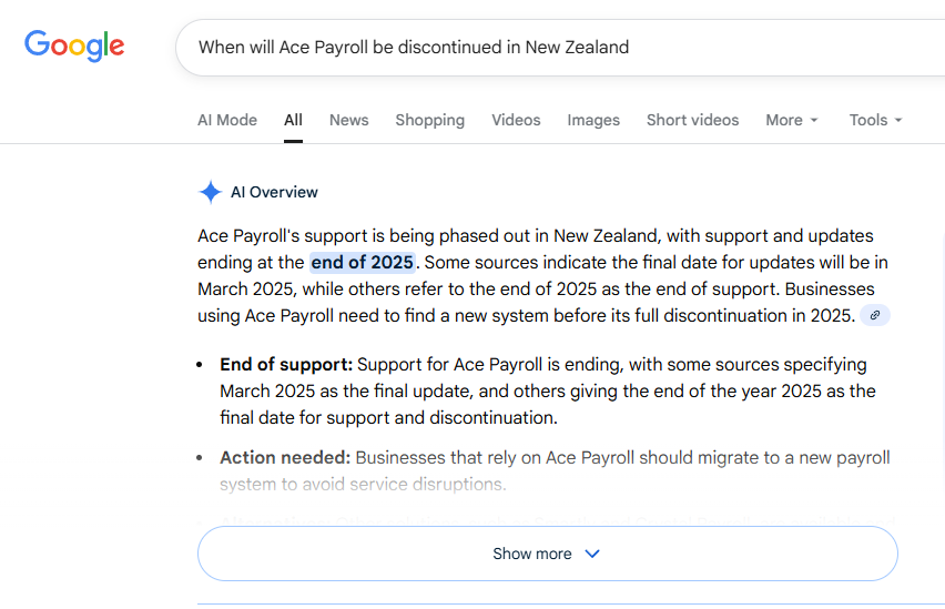 Good call on double-checking the dates and sharing the link. I can’t confirm that March 2025 end date, as the information we have states that Ace Payroll will be decommissioned on 1 April 2027. You can check this link for more info about the decommissioning.