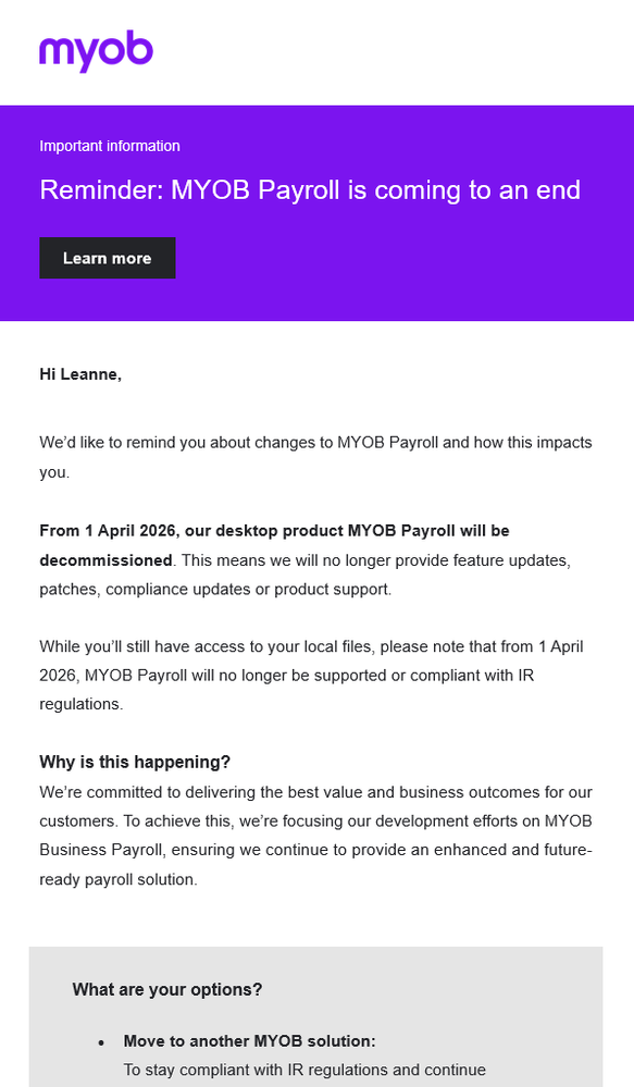 - MYOB Payroll support ends in April 2026.