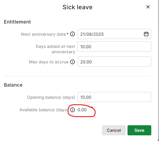 An employee's sick leave anniversary date was on the 21st of August 2024 where he was entitled to another 10 days sick leave. I'm using, MYOB Business Payroll only and it did not update the sick leave and he still has a zero balance when it should be 10. I've tried adjusting the leave and adding the balance manually, but nothing is working. Can someone help. Thank you.