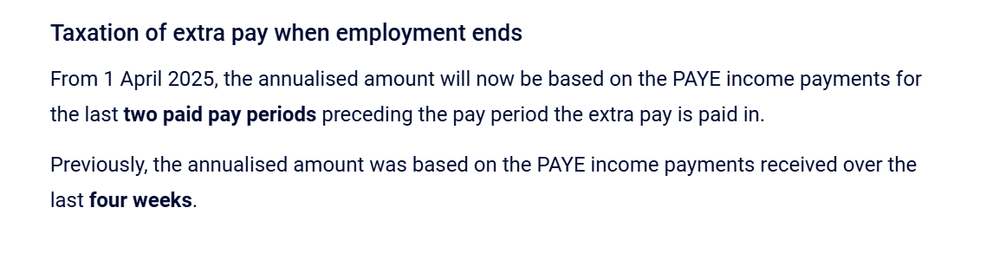 The release notes for MYOB payroll desktop version 2025.1 included the above note re: taxation of extra pay when employment ends.