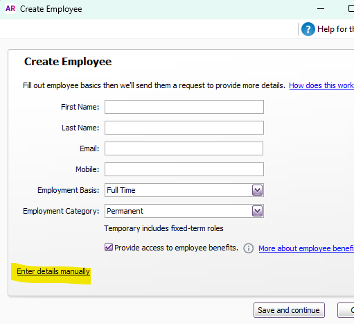 Hi there, NZ does not have employee self-onboarding at this stage. In AU, there is an option to set up employees manually. Click the arrow beside save (as below).