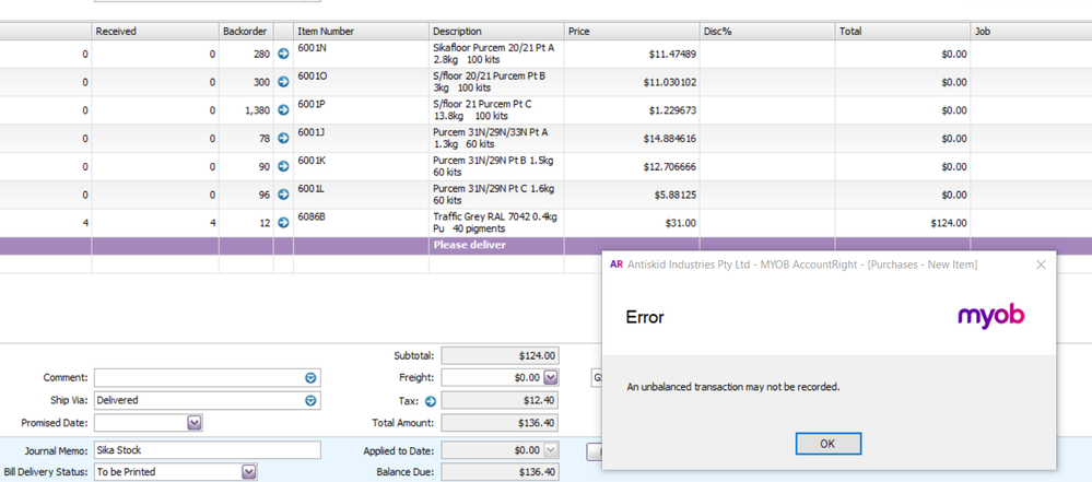 Below is my Order that I'm trying to turn into a bill for the last item that we received, where all the other items are backordered. I continually receive this error when doing this. There's a fault in MYOB for many years and they are not fixing it. I don't think that we should have to manually type in the values to fix it, the software is here to make our jobs easier, not harder! And by the way, as I said above, it's not working!
