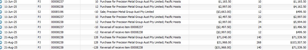 The item cost should be $249.75 each MYOB has valued them at $510.99.