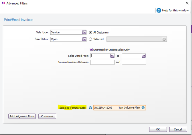 Thanks for your post. I'd recommend checking if you've selected a form for sale that will be used automatically when printing/emailing the invoice. You can find this by going into advanced filters in the print/email invoices window.