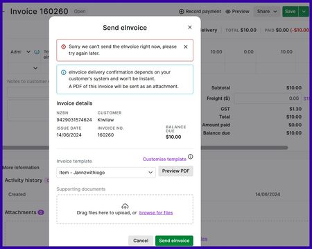 It seems like you're having a bit of a hiccup with e-invoicing. No worries, we've got your back! Let's start by clearing the AccountRight cache. That often does the trick for weird stuff happening in there. If the error sticks around, we can try sending a dummy invoice to your client. That way, we can see if the issue's with the invoice itself. Don't hesitate to reach out anytime you need more help. We're here for you.