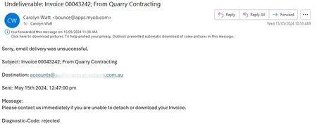 We are experiencing what I can see on the forum what others have - email bouncing with diagnostic: rejected. Our client's IT have asked me to contact MYOB to unblock the email address, can anyone he...