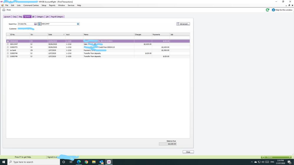 I tried to reverse the invoice on June 30 and have done something wrong because it hasn't changed the original transaction.