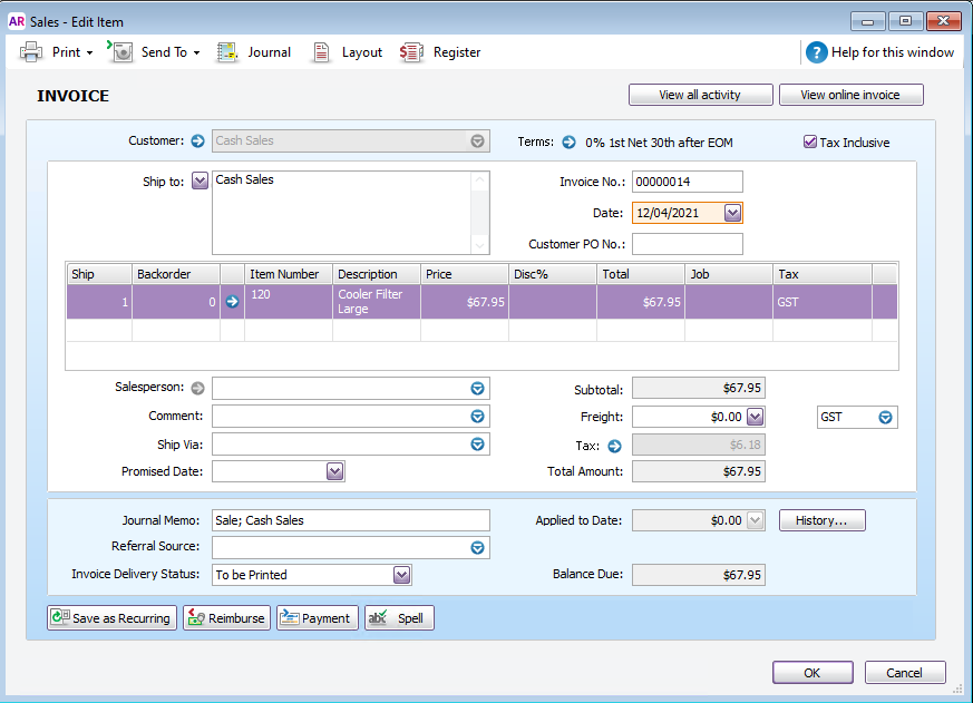 If you do have a lot of one-off customers or cash customers, most users will have one customer card to represent those customers and then enter an invoice for that one customer (as per the below screenshot). This way you can record the invoice so it impacts item values and also allows for the payment to be recorded either via the Paid Today or Receive Payments window.