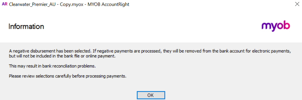 2. Tick the necessary negative transaction. You will encounter a message similar to the following - select OK.