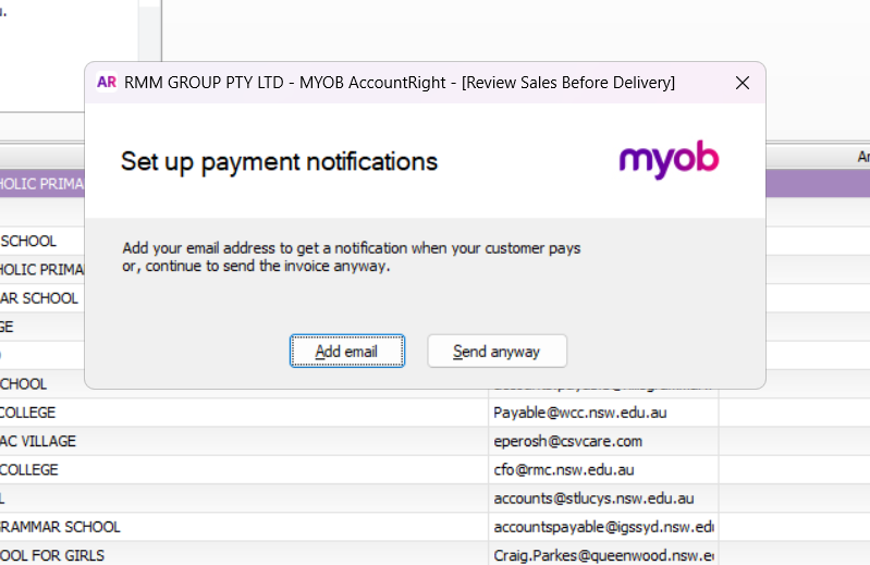 Totally get how annoying that pop-up would be, especially when you're sending emails all the time. Normally, once that message pops up, clicking Add email and setting an email address should stop it from appearing again. If clicking Add email isn't doing anything though, that does sound like a bit of a software hiccup. A good first step is to try clearing your AccountRight cache, then jump back in and see if the option works as expected.
