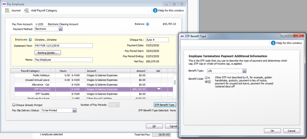 When you use an ETP based specified ATO reporting category on your employee's pay you will have the option within the Pay Employee window to select the ETP Benefit Type. Within this window, you can select the Benefit Type and the corresponding Benefit Code. There is a brief definition of each code when selected, however, if you do require further assistance with what Benefit Type and Code to use best speak to the ATO