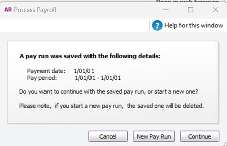 - Click "Continue. On AccountRight desktop version, click on "Continue" to go ahead with the saved pay run and see if there's any further issues.