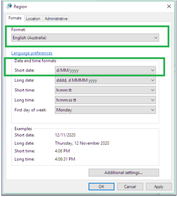 5. In the region window, make sure the format is correct as: English (Australia)