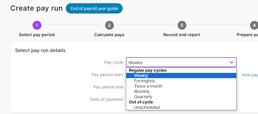 Following the instructions in the help article: https://www.myob.com/au/support/myob-business/payroll/processing-a-final-pay, it mentions to select 'Final Pay' from the Pay Cycle dropdown menu, but when I go to do this, I don't have 'Final Pay' as an option (see screenshot below).