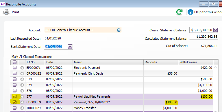 I'm sorry to see that no one has replied to you yet. When you reverse a transaction the original transaction is still recorded in the software. This means that when reconciling you would tick both the original and the reversal as they clear each other out: