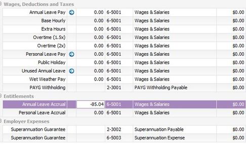 You only need two sides to an entry when you are posting amounts to accounts. Adjusting the entitlement balance doesn't post amounts to any accounts, so there doesn't need to be two sides to the entry. The transaction just reduces the Annual leave accrual balance by 85.04 hours.
