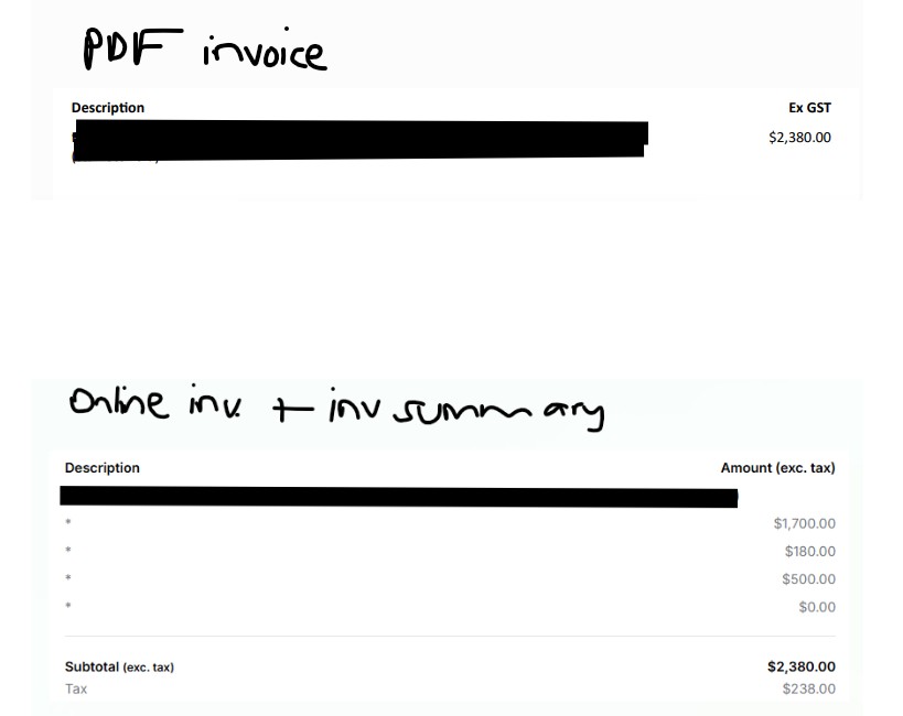 You allow us to create our own templates for sending invoices, so I think the version the customer sees in the invoice summary and the invoice portal(?) should match what they see if they open the PDF.