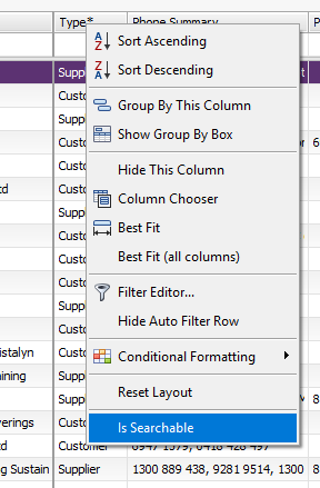 Just an update here on this one.  Have found a way to stop searching the word customer or supplier.  By right clicking on the field heading you can exclude that column.  Just untick "Is Searchable".  At least this helps to speed things up a little.  You'll notice the field gets an asterix next to it and it will not be searchable.