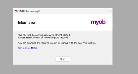 Repro steps: install latest myob version from https://download.myob.com/arl/Current/MYOB_AccountRight.exe Download https://www.myob.com/au/support/myob-business/get-started/welcome-to-myob-business/using-the-sample-company-file-clearwater?productview=Browser open above sample file and appear below error. Why appear below errors, I haven't encountered it before, but I encountered it in the latest update. It says my app version is not the latest, but I have already updated it to the latest version.Login Issues