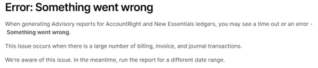 Is this an issue that is going to be fixed? I have a number of clients who like these reports but if there is a large amount of data they just dont generate and I need to prepare manual packages which is too time consuming. Selecting a different period is an unusual work around - monthly reporting is monthly reporting - I cant select a different month and pass it off as the month for which the report will not generate!!MYOB Advisory Save and Export Not Working