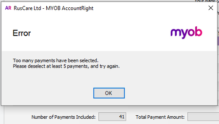 Hello there. We have had this problem for a few years. Since we upgraded to AccountRight on the cloud the Electronic Payments only allowed us to select up to 42 payments in one batch to print the payment summary. This has changed to 36 payments after we upgraded to 2024.4 last week. Is this some sort of bug or any setting for payment security in the software? Can we change the limit for the number of payments in a batch manually anywhere in the settings? It would be absolutely ridiculous when 40 payments in one batch is considered as 'too many'.